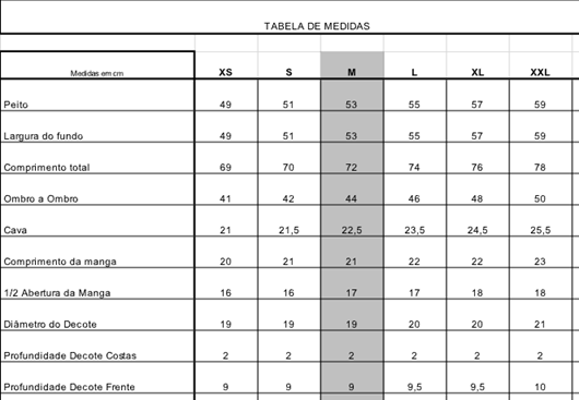 | Tamanho | XS, S, M, L, XL, XXL |